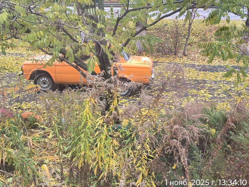 Приехал домой и бросил перед домом. А когда переодевался, выглянул на него из окна. Вот он, мой цвета апельсин камаз. На фоне осени так незаметен!